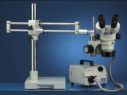 Binocular style interpupilary adjustment; Each eyepiece has adjustable diopter setting; Field of View: 32.8 - 5.1mm; Working distance: 118mm; Heavy duty cast metal body; Wide assortment of Objective Lenses and Additional Eyepieces --- Binocular Stereo-Zoom 23mm Microscopes offer superior convenience and uncompromising optical quality. A 26" stainless steel horizontal boom extension and 19.5" vertical boom are mounted to a 10" die-cast base. Ball-Bearing design allows fluid horizontal extension of the boomstand. Extensive flexibility and adjustability allow this microscope to alter angles up to 45 Degrees; the head can be rotated 560 Degrees in its focus mount. These 23mm microscopes offer an 8" working distance and 15% greater field of view than comparable Luxo System 250 models. Microscope magnification range of 7x to 45x.